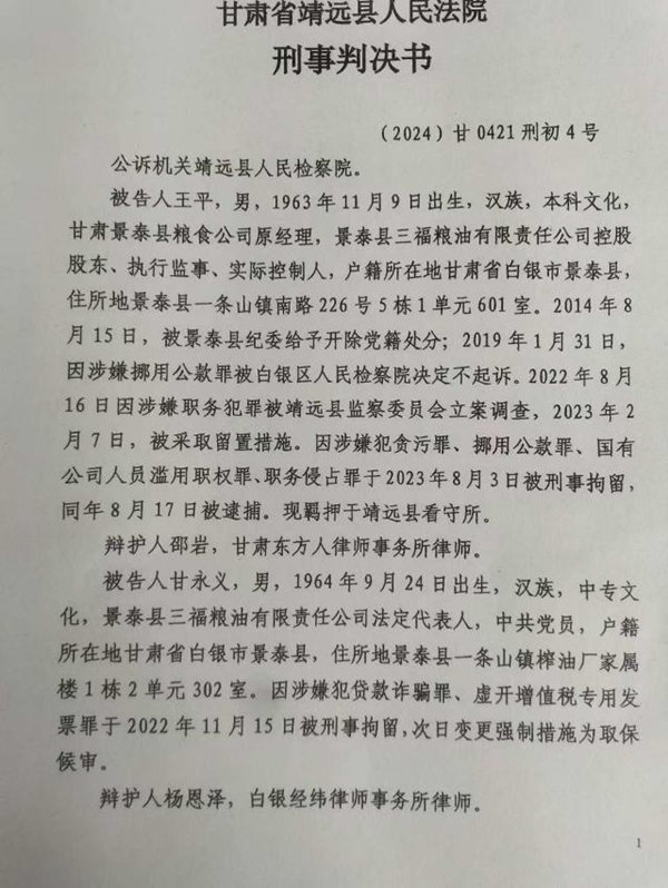 2025年6月26日,景泰三福粮油实际控制人王平涉及贪污、挪用公款、滥用职权、职务侵占、骗取贷款等多项罪名被靖远县人民法院判处有期徒刑二十年;景泰三福粮油法定代表人甘永义犯骗取贷款罪判处有期徒刑三年;景泰三福粮油公司犯骗取贷款罪,判处罚金十万元。